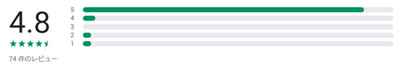 GooglePlayの評価とレビューをみてみると、平均評価は4.8とかなりの高評価アプリだとわかります。ただ、レビュー自体が少なすぎるためあまり参考になる数字とは言えません。