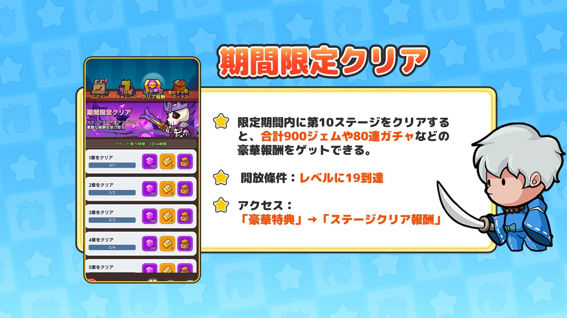 期間限定ステージクリアイベント: ゲーム開始から7日間開催。全メインクエストチャレンジをクリアすると、合計「召喚チケット×80」が獲得できます!
