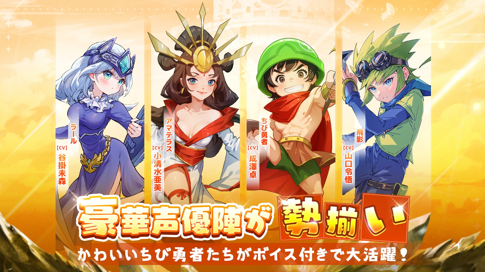 『ちび勇者の伝説:魔竜との戦い』のリリースを記念し、<7日間ログインボーナス>と<7日間チャレンジイベント>を開催いたします。イベントをクリアした特典は、2体ものSSRヒーローが獲得し、「アマテラス」を加えれば、序盤から3体のSSRヒーローで敵を圧倒できます!