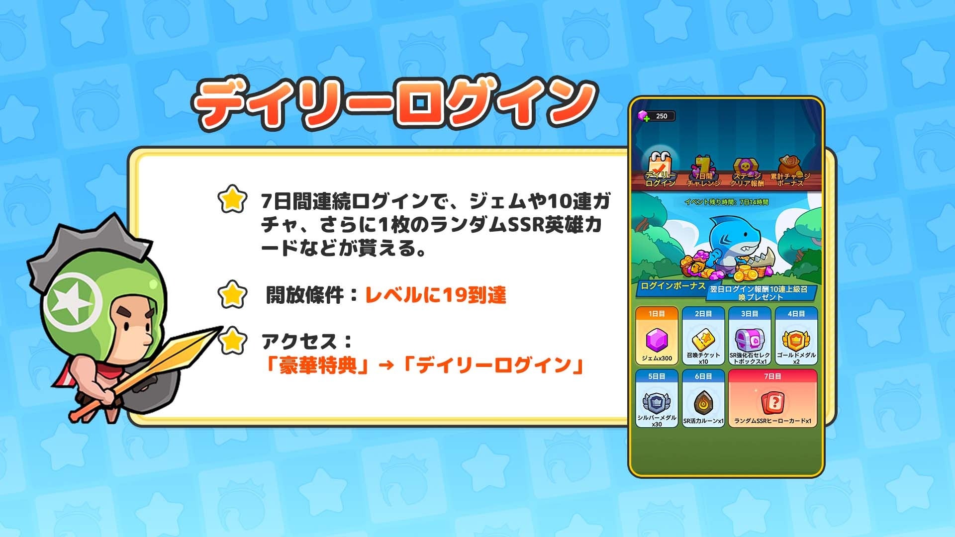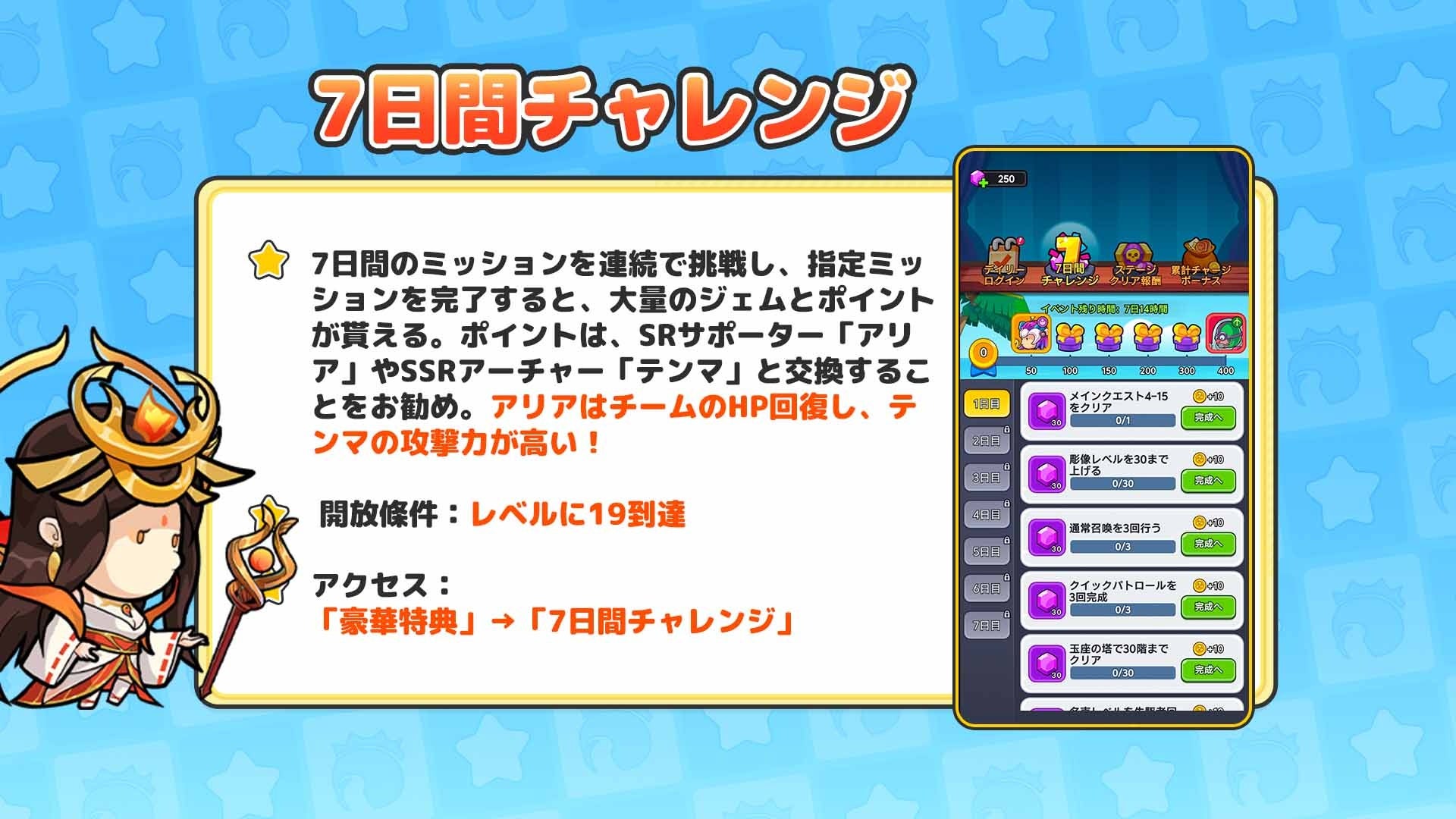 7日間チャレンジイベント:ゲーム開始から7日間開催。全ミッションクリアで、合計1000ジェム以上獲得可能。獲得ポイントでジェムや指定のSRサポーターヒーロー、さらにはSSRヒーローと交換できます。