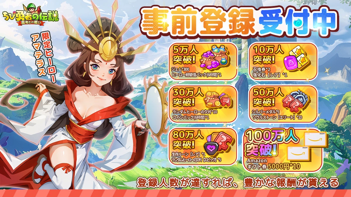 ダウンロード後はログインするだけで、なんと7777連ガチャを無料でお楽しみいただけます。さらに、日本限定SSRヒーロー「アマテラス」も入手可能!このヒーローが、ちび島を救う冒険で強力な助っ人となることは間違いありません。